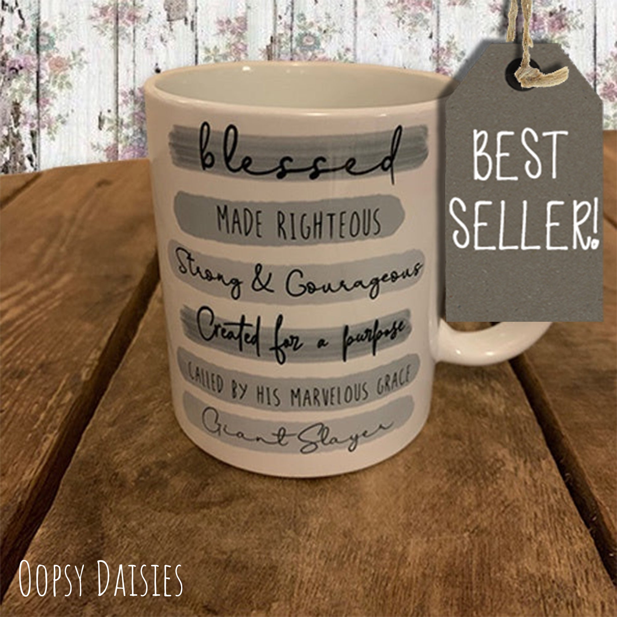 This mug is part of our Highlights range which is wording to suit many occasions but with the added touch of a watercolour wash underneath the wording giving it an elegant touch.  This particular mug is highlighted with the following scripture wording and promises in different fonts: "Blessed" "Made Righteous" "Strong & Courageous" "Created for a purpose" "Called by His marvellous Grace" "Giant Slayer".  On the other side of the mug is a little handrawn heart and the wording "Chosen" underneath, making it a really lovely gift suiting birthdays, friendship gift, Christmas or just a gift of encouragement.  It can also be the perfect reason just to treat yourself! - wake up in the morning with your morning tea or coffee and remind yourself of who you really are!