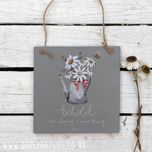 These square wooden plaques are such a lovely addition to the home as well as a beautiful gift. These one is designed with our favourite flowers, daisies presented in a watering can on a grey/blue background. Underneath is the wording "Behold I am doing a new thing Isaiah 43:19"