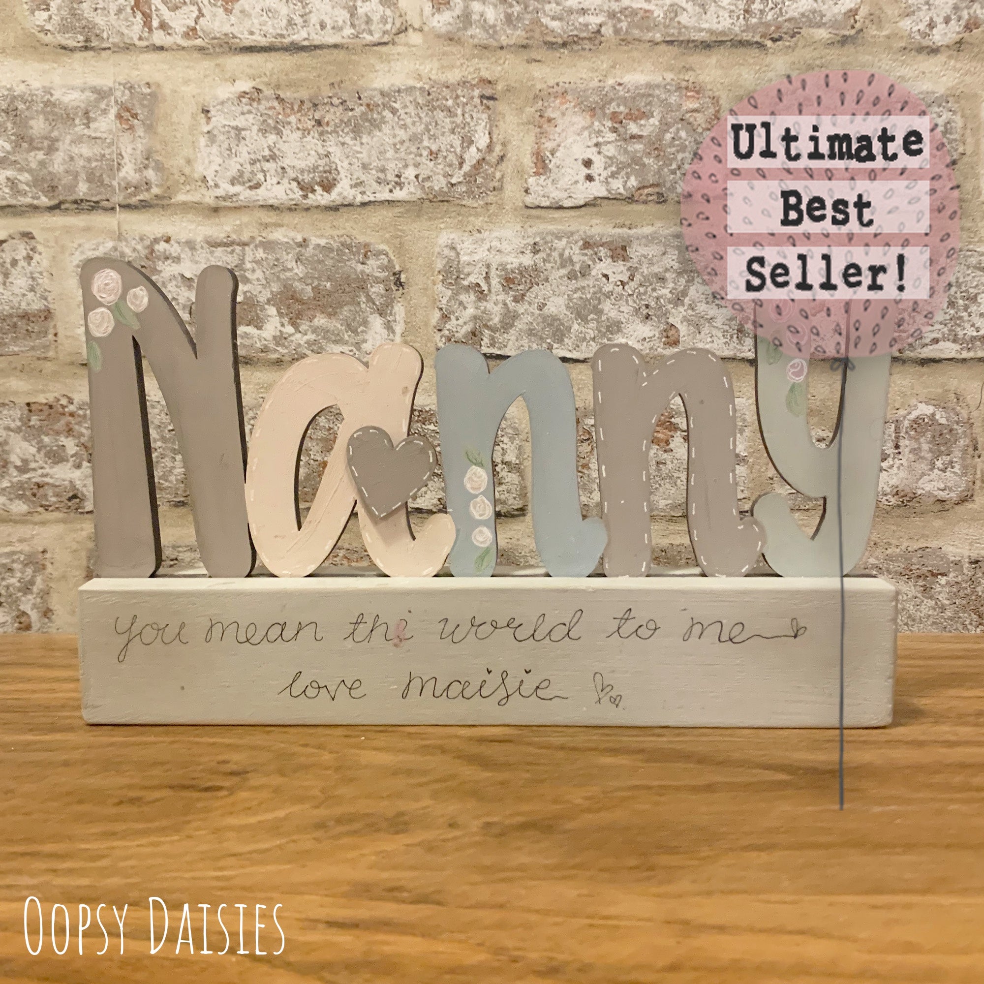 An adorable gift for Nans is this freestanding block which can be personalised to give it that extra special touch. Choose your own phrasing - Nanny, Nanna, Grandma... and your own wording on the block (see instructions below). This one is designed in pastel shades.