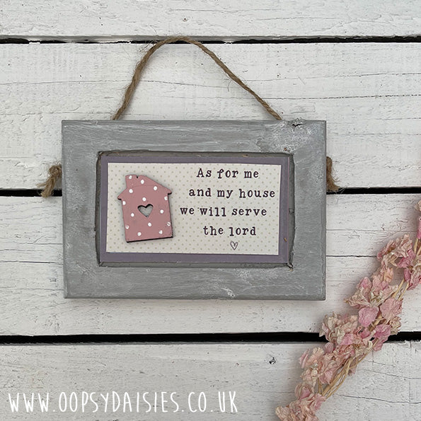 We love Country and Rustic styles so, these mini pictures have been a joy to design and create. Made from recycled pallet wood, the rustic effect frame has been lightly painted and varnished and hung with jute string. Inside is a shabby chic effect card with the saying "As for me and my house we will serve the Lord" and finished off with a hand painted little wooden house decoration. A really beautiful addition to the home, a treat for yourself or a cute little gift.