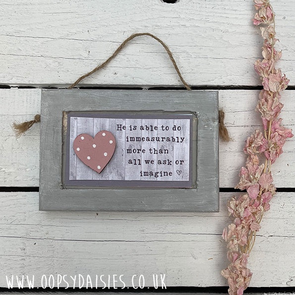 We love Country and Rustic styles so, these mini pictures have been a joy to design and create.  Made from recycled pallet wood, the rustic effect frame has been lightly painted and varnished and hung with jute string.  Inside is a shabby chic effect card with the saying "He is able to do immeasurably more than all we ask or imagine" and finished off with a hand painted little wooden heart decoration.  A really beautiful addition to the home or a cute little friendship gift.
