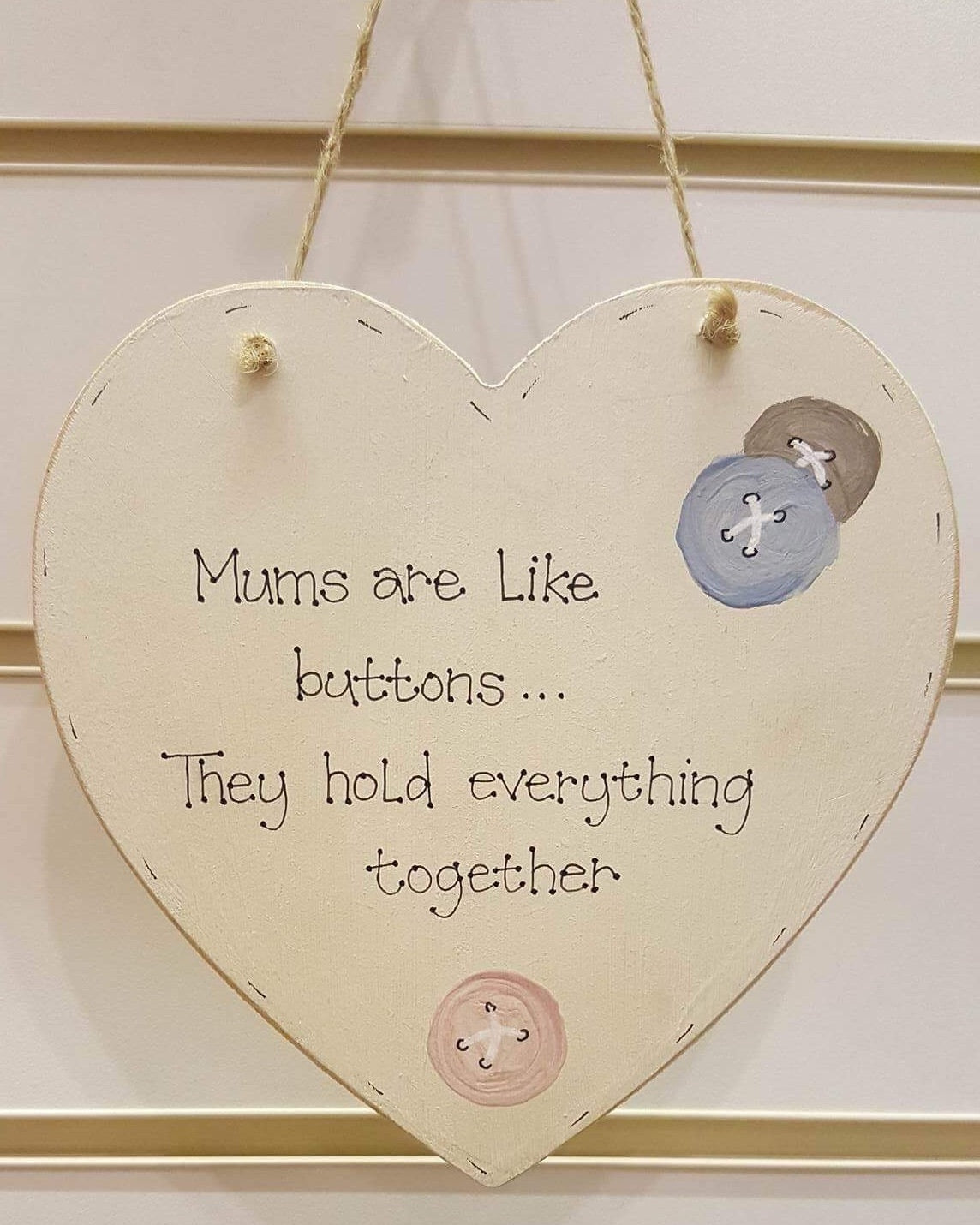 A handmade wooden heart with one of most popular sayings "Mum's are like buttons, they hold everything together"