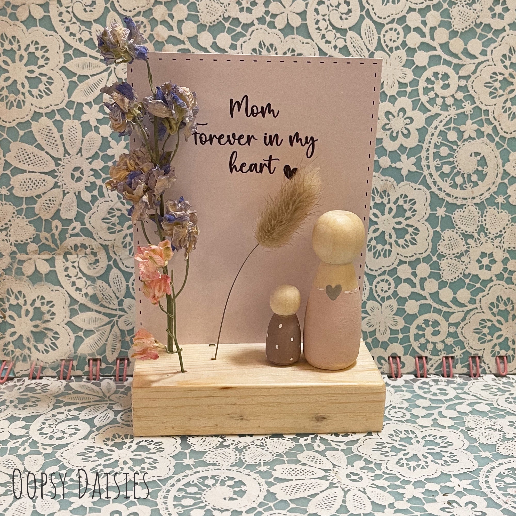 This one has been espcially designed for people who have lost their moms with 2 peg dolls (example shows our larger doll and Tiny Doll) and a back card with the wording "Mom Forever in my Heart". Ideal gift for the times of year where it can be especially difficult wuch as Mother's Day and Birthdays.