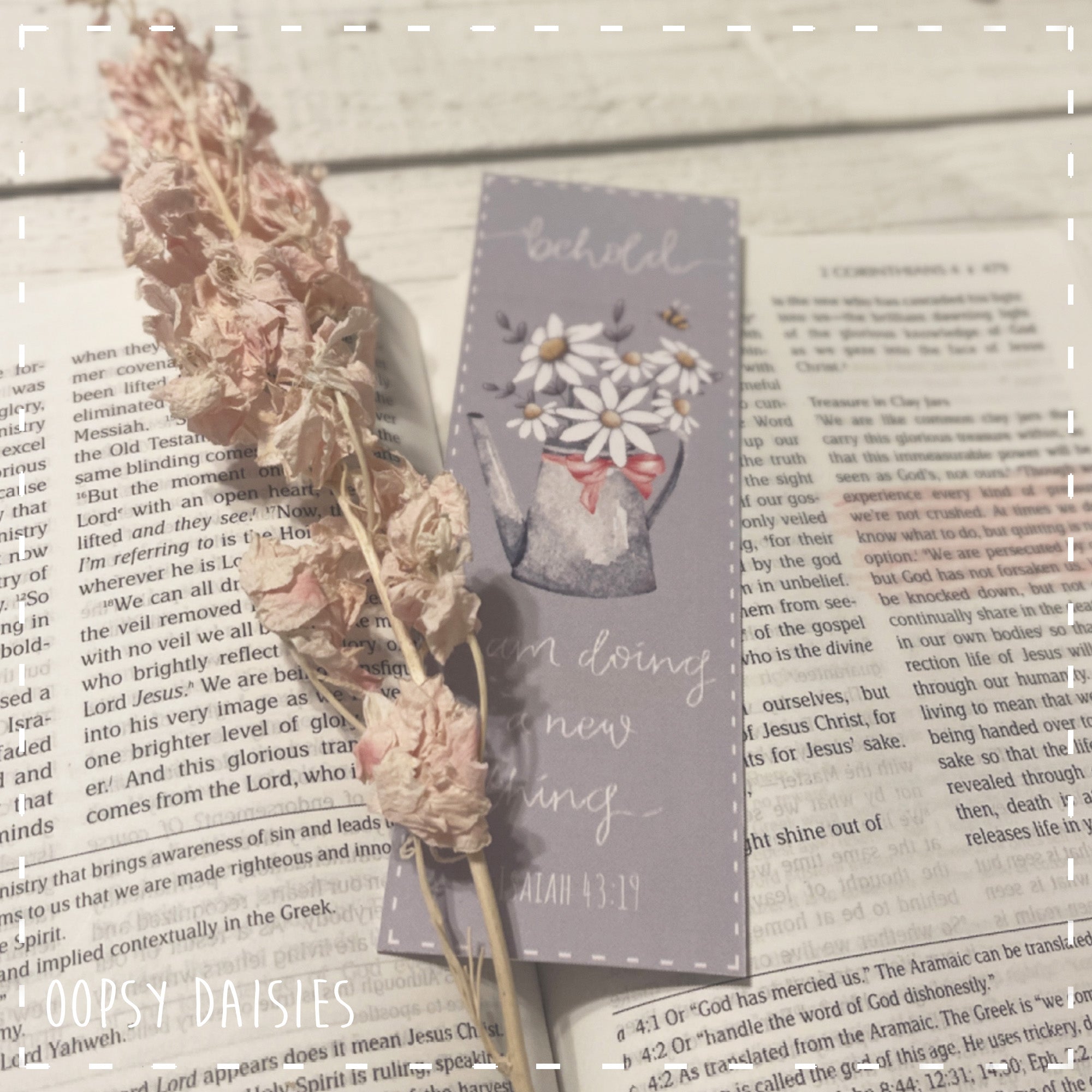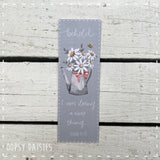 These bookmarkers are the perfect addition for your bible or favourite book or make a cute little gift!  This one is designed with our favourite flowers, daisies presented in a watering can on a grey/blue background.  Underneath is the wording "Behold I am doing a new thing Isaiah 43:19"