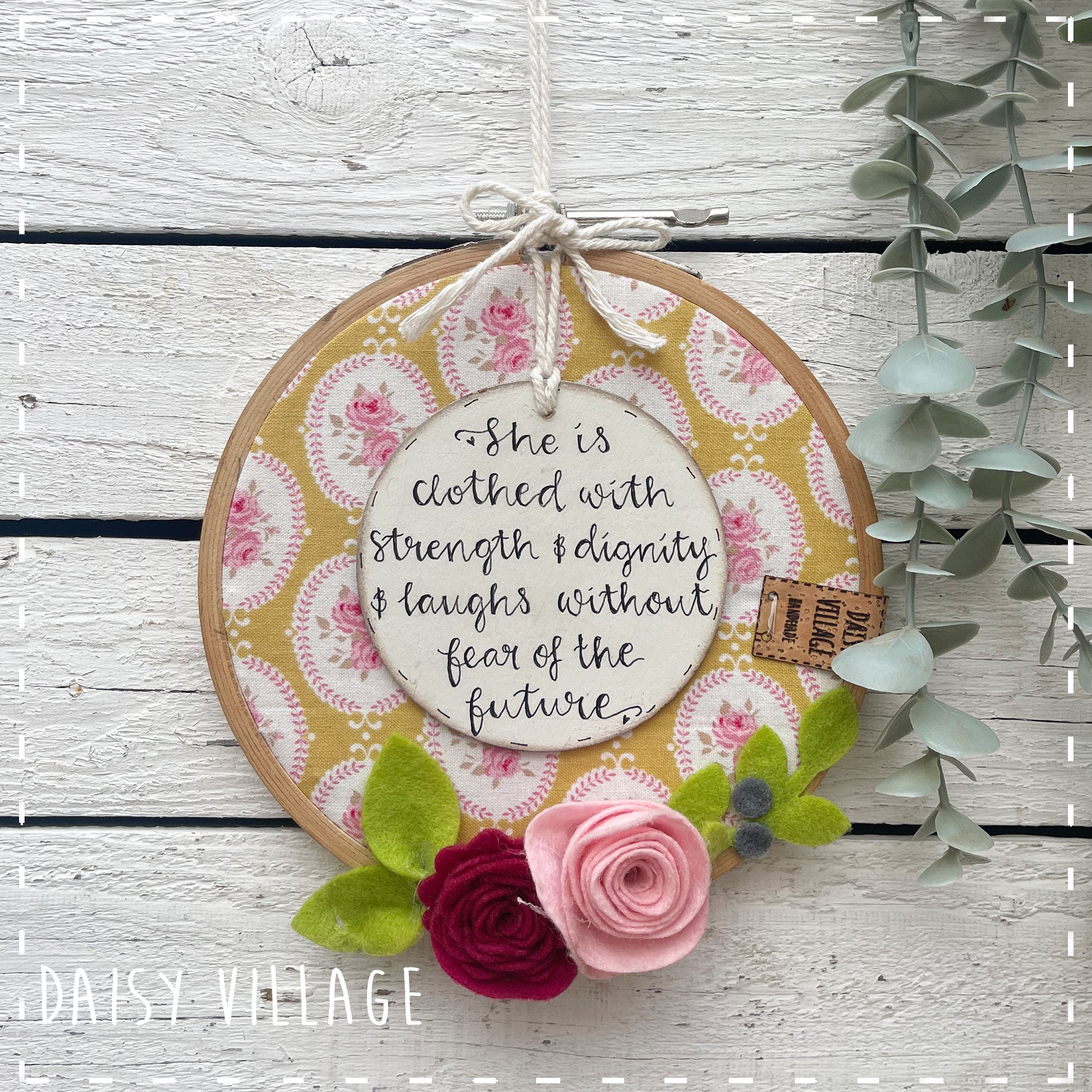 This Daisy Village embroidery hoop features the timeless verse “She is clothed with strength & dignity and laughs without fear of the future.” Set against a vintage-inspired floral fabric, it’s finished with soft felt flowers and leafy details for a charming handmade touch.
