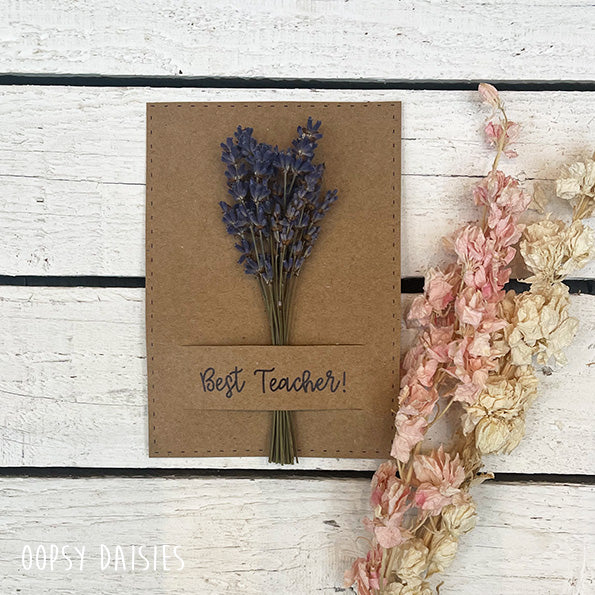 These mini posies presented on card are the perfect little gift for Teachers and Teaching assistants. Dried flowers of Lavender is tied with jute string and inserted into a brown kraft card with the wording 'Best Teacher" across the slit.