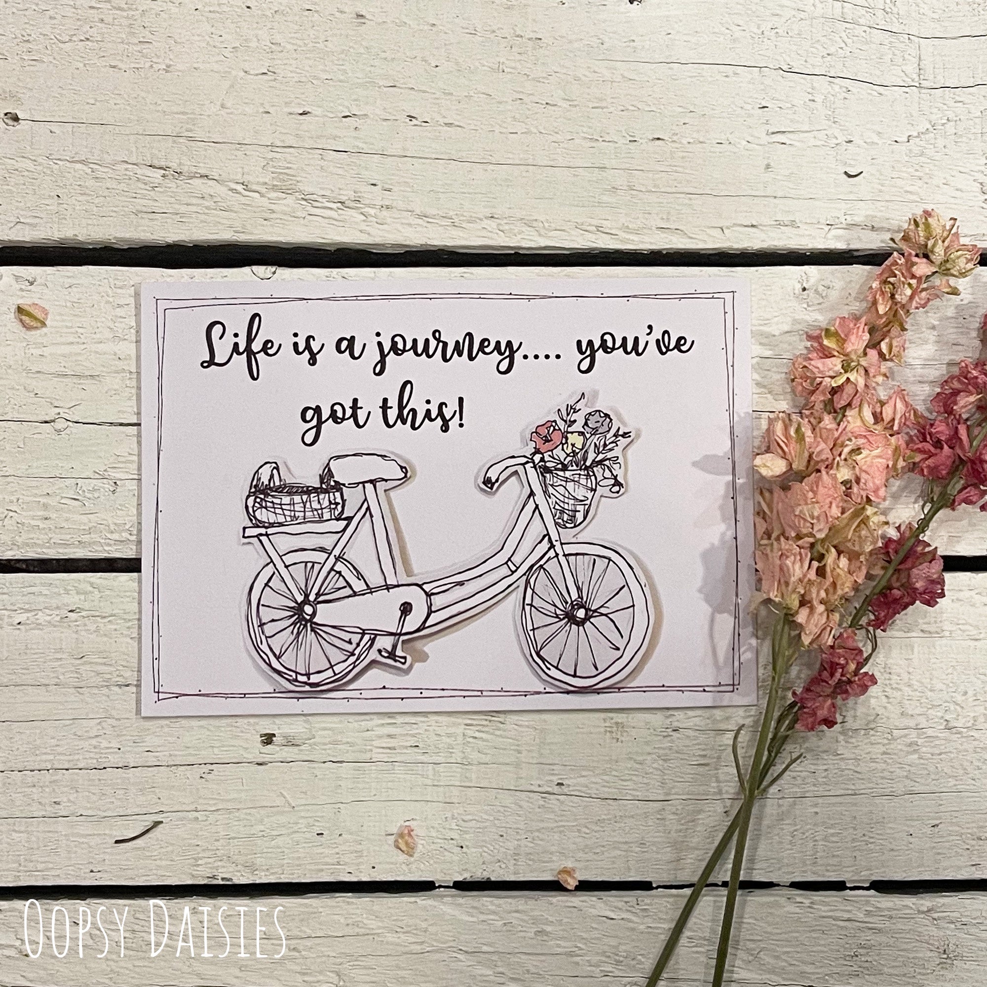 These prints are postcard size And are perfect for mounting in a frame, bookmark, scrapbooking, postcard/card for encouragement as well as a beautiful gift.  This design is part of our Doodles range and it is just what it says it is!  Daydreams and doodles in my sketchbook of all that is lovely and wherever the imginations goes.  Cute sketches in black & white with a little hint of colour somewhere.  This design is a cute bicycle with a flowere basket and the wording "Life is a journey....you've got this".  Gorgeous gift idea - especially for Birthdays, friendship