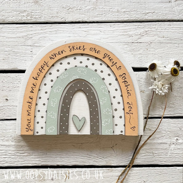 A chunky freestanding wooden white block with wooden cut outs to the front to give a 3D effect. This one is painted in fresh coral and mint shades blues with cloud and polka dot patterns. Finished off with a little wooden heart in the centre and the option to add your own wording / personalisation to one of the rainbow arches.